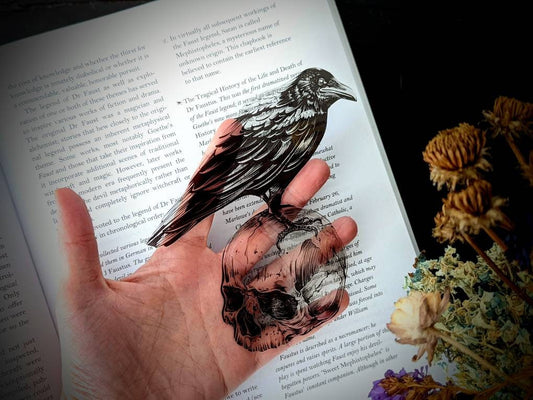 Clear Bookmark Raven Crow Corvus Human Skull Goth Gothic Halloween Horror Dark Academia Handmade Artist Book Reader Lover Gift